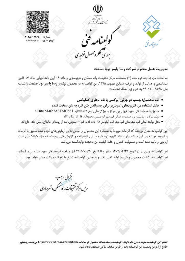 گواهینامه فنی چسب دو جزئی اپوکسی